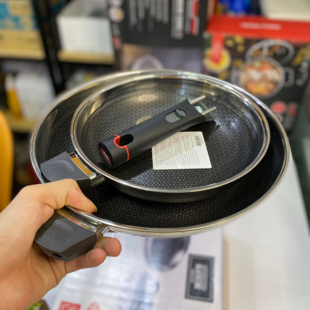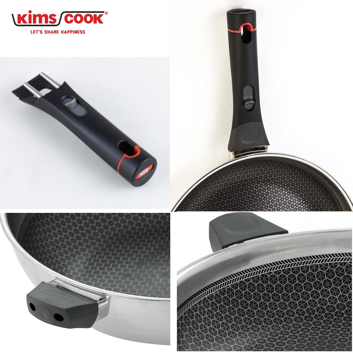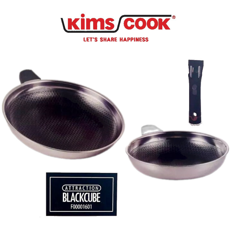 Bộ 2 chảo inox chống dính cán rời Kim's Cook Blackcube 22 & 28 cm Hàn Quốc với thiết kế hiện đại và tiết kiệm năng lượng sẽ không làm người tiêu dùng thất vọng. Bộ nồi chảo với bề mặt lòng tiếp xúc với thực phẩm không chứa PFOA đảm bảo an toàn cho người dùng. Sắc đen của lớp họa tiết lục giác mang lại vẻ tinh tế cho sản phẩm và nét sang trọng cho căn bếp nhà bạn. Công nghệ chống trầy đột phá cùng bề mặt chống dính hoàn hảo, giúp giảm thiểu tối đa lượng dầu khi nấu nướng. Kết cấu 3 lớp dẫn nhiệt đều và nhanh mang đến những món ăn trọn vẹn hương vị tươi ngon và tốt cho sức khỏe cả gia đình. Tay cầm tháo rời giúp dễ dàng chùi rửa, giảm thiểu vướng víu khi nấu ăn và tiết kiệm không gian cất trữ.