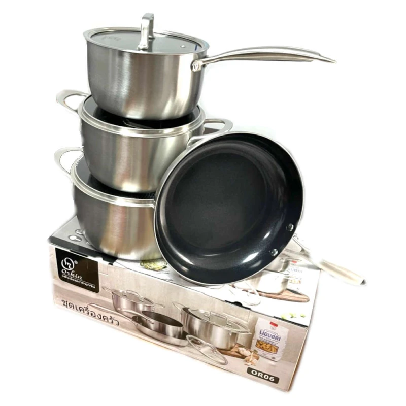 - Bộ nồi cao cấp Orkin được thiết kế cổ điển nhưng vô cùng tinh tế và trang nhã, sang trọng, hiện đại phù hợp với nhiều không gian nhà bếp. Bộ gồm 3 nồi: 18, 20, 24 cm và 01 chảo 26cm rất thông dụng phù hợp nấu nướng với mọi món ăn của gia đình.