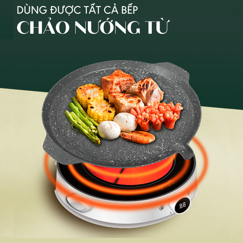 - Chảo Đá Nướng BBQ Hàn Quốc đáy từ – 28Cm – kiểu tròn – có rãnh thoát dầu tiện ích – Vĩ Nướng Thịt Chống Dính