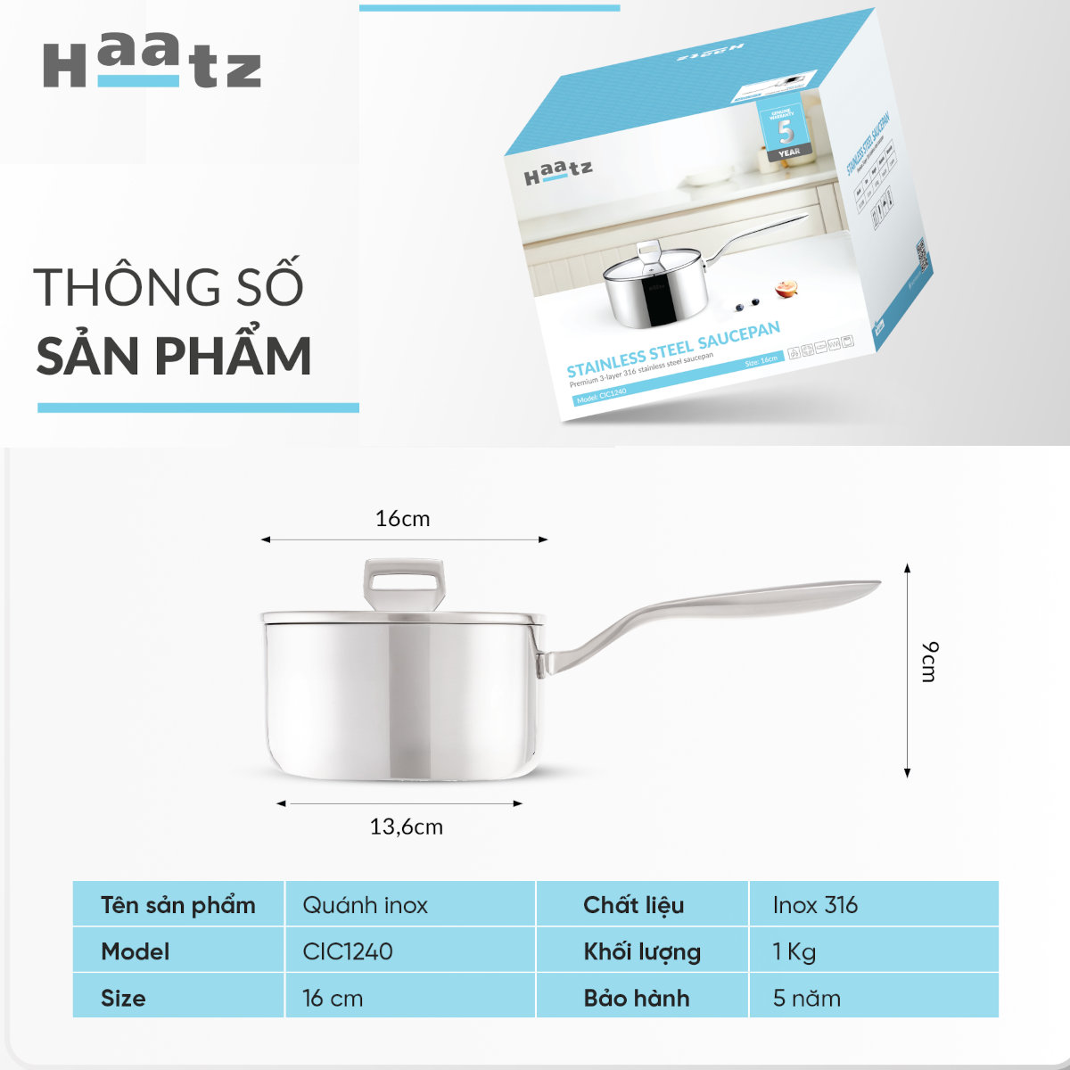 Quánh Inox 316 thân đúc đáy liền Haatz Hàn Quốc size 16cm, bảo hành 5 năm