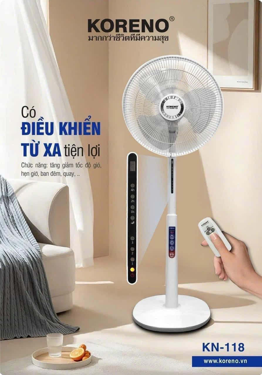 Tên sản phẩm: Quạt điện Koreno KN-118 Loại quạt: Quạt đứng Model: KN-118 Thương hiệu: Koreno Thái lan Công suất: 60W| Điện áp : 220V - 50Hz Đường kính cánh quạt: 40 cm (16 inch) Số cánh quạt: ...Quạt cây có khiển Koreno Thái Lan KN 118 công suất 60W, 3 cánh 40cm